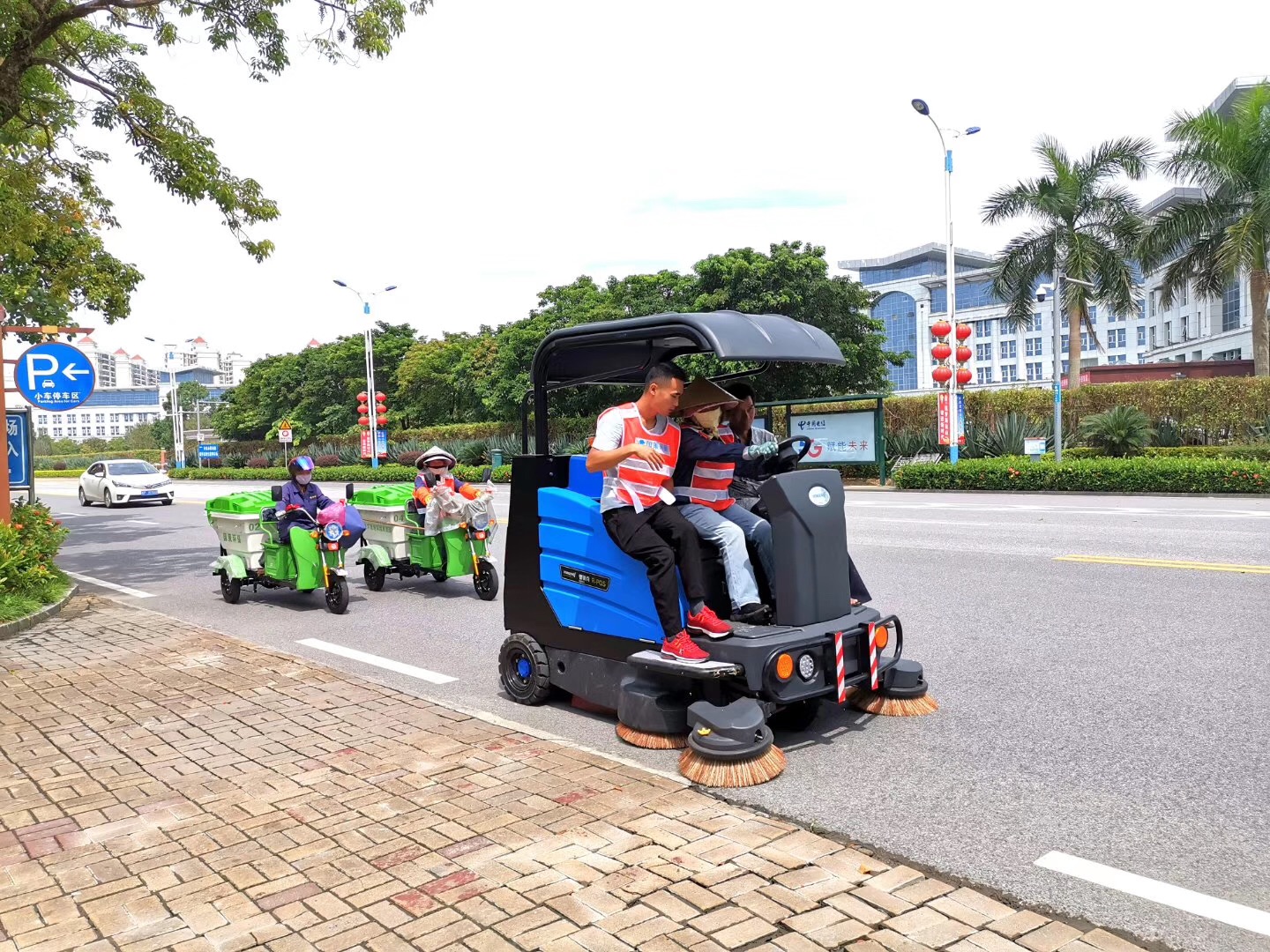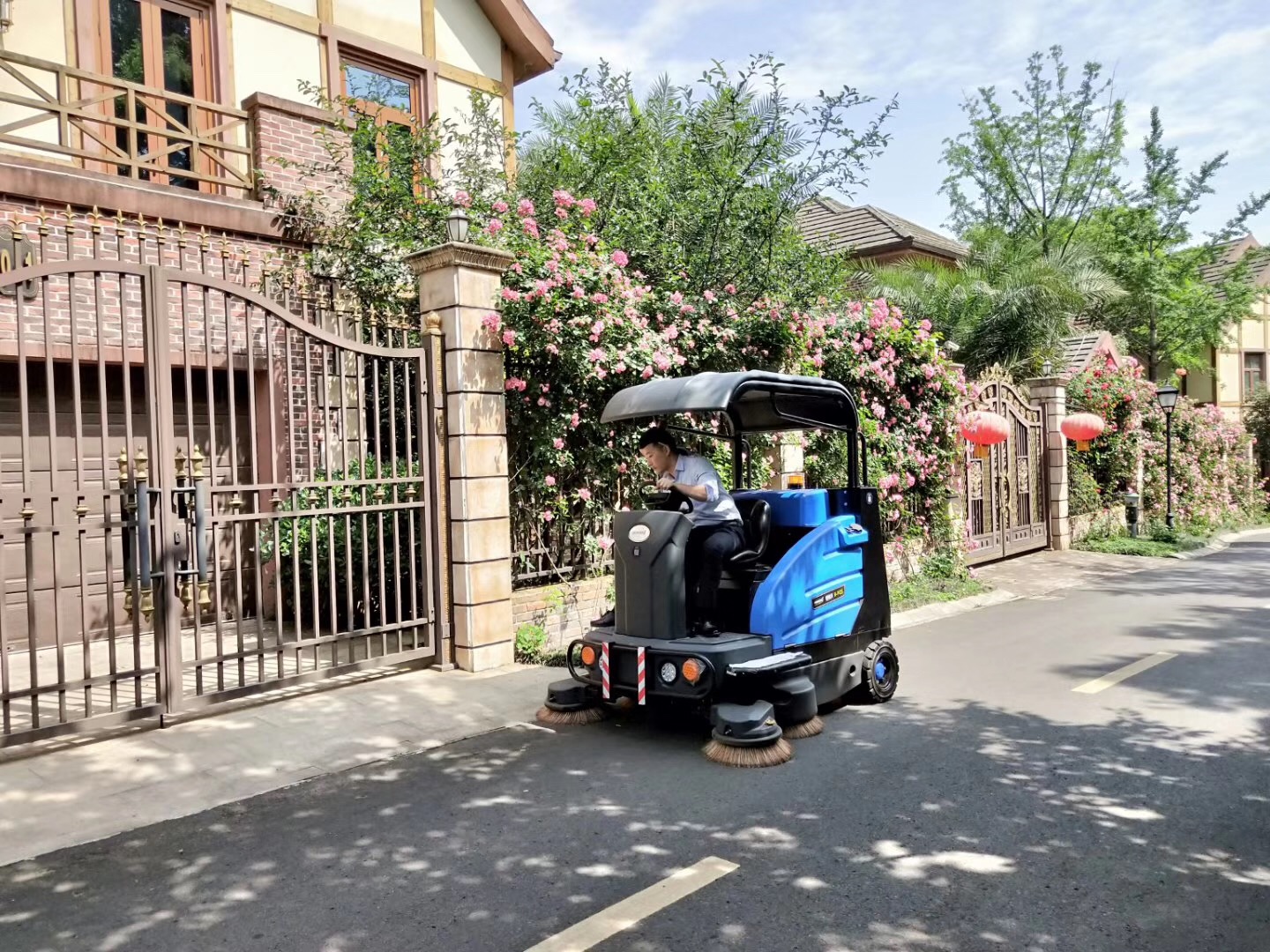 很多物業公司都會選擇電動駕駛式掃地車來進行小區的清掃。原因是小區的街道清掃跟公路的清掃不一樣,小區的街道一般偏窄,而且不像公路一般通暢,可以用大型燃油的公路清掃車來清掃。很多小區都有專門的保潔人員,不過他們一般都是配備掃把、簸箕,清掃效率低;小區面積大了,那單純的靠人工清掃就不太可能了。