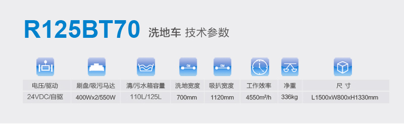R125BT70駕駛式洗地車,一款擁有“高清洗效率”的品質洗地車。通過實踐,其效率相當兩臺大型手推式洗地機。回旋直徑小,在狹窄的區域內也有很好的機動性。輕松通過90厘米寬度的門道。