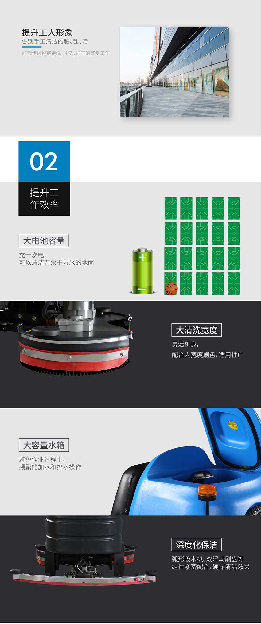 用途:駕駛式洗地車,高清洗效率,低分貝運作,提升工作效率。