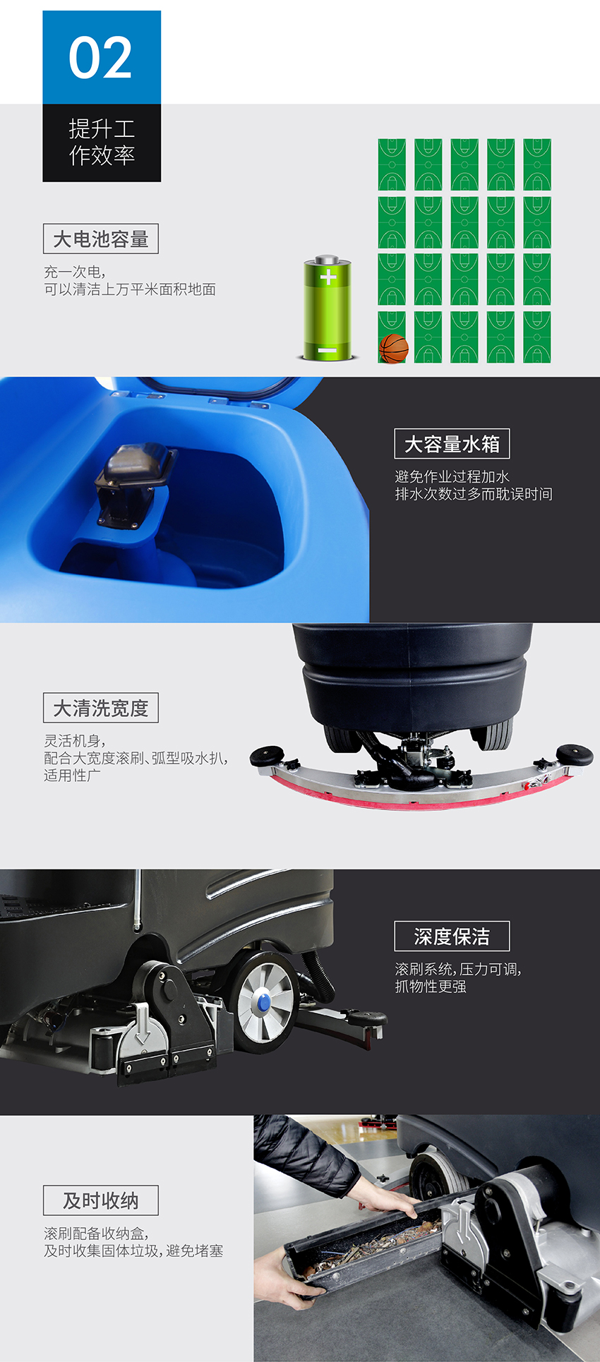 用途:洗掃一體機是集洗地掃地功能于一體的二合一機型,洗地效率達4550㎡/h,是大型物流配送中心等地面清洗和清掃的好選擇。
