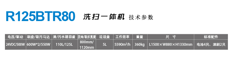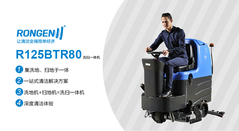 R125BTR80洗掃一體機,集洗地、掃地于一體,能夠在更為復雜的環境下,為清潔作業提供深度清潔體驗。擁有一臺容恩洗掃一體機,相當于同時擁有一臺全自動盤刷式洗地機和一臺全自動掃地機。